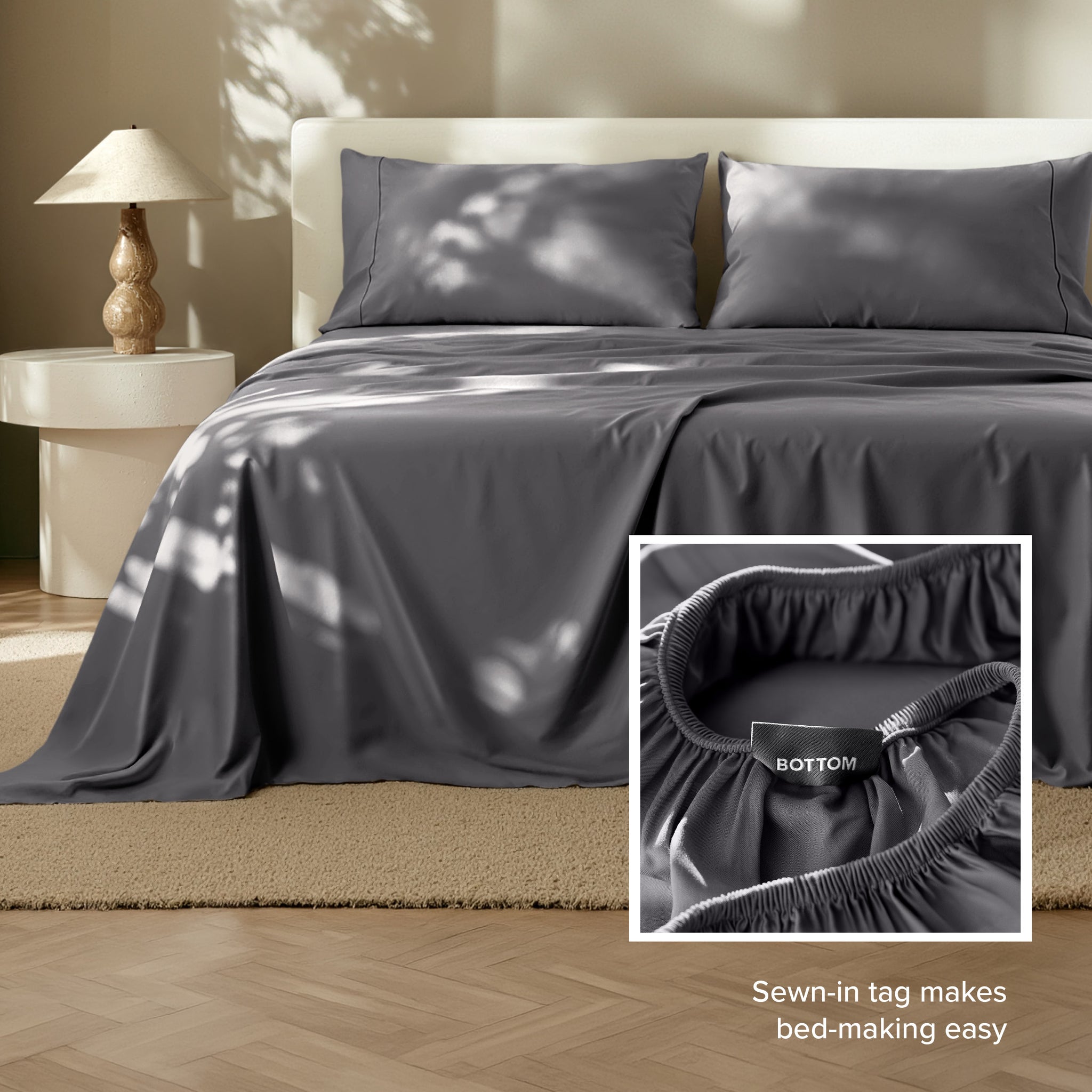 Tag on bottom of fitted sheet simplifies bed making.